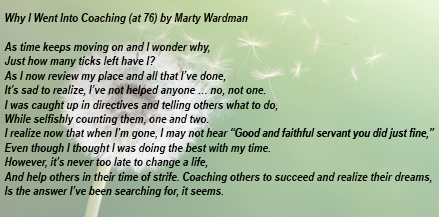 A new passion of mine, flamed by my friend and mentor Richard Leider (Claiming Your Place At the Fire) is to use coaching to create a new view of eldering and vital aging. It is an opportunity for coaches to work both for themselves and their clients by being mentors to those younger or at an earlier stage in life. Coaching for purposeful living is a big aspect of this and both Richard and I view getting the word retirement out of our vocabulary. I have shifted my language to calling it protirement — a word I learned from Frederic Hudson (author of The Adult Years). To that end I have asked a few wise elders of coaching to share their perspectives with us, which you can read in future blogs.